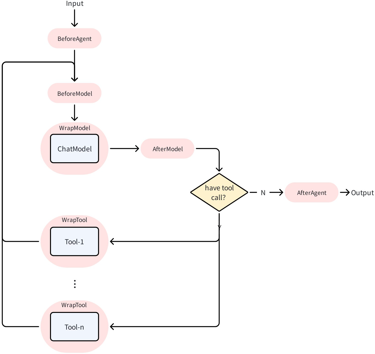 - It sends the tool result back to ChatModel (Observation), then starts a new loop until the model decides no tool is needed and stops