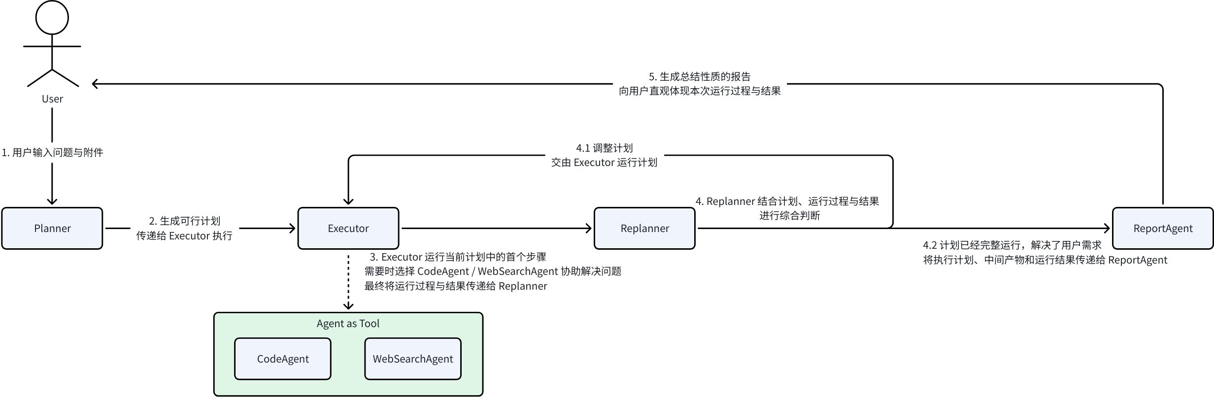 - Loop: Executor + Replanner repeated