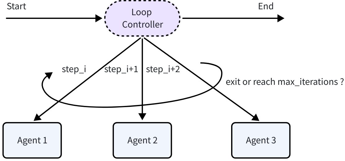LoopAgent:重复执行配置的子 Agent 序列,直到达到最大迭代次数或某个子 Agent 产生 ExitAction,每次迭代的结果都会累积,后续迭代的输入可以访问所有历史信息。LoopAgent 基于 SequentialAgent 实现。
