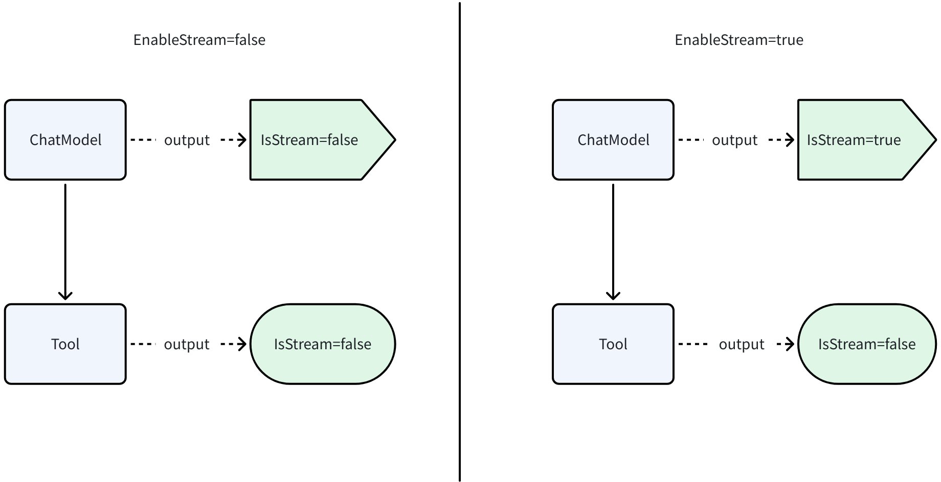 EnableStreaming=false: both output non‑streamEnableStreaming=true: ChatModel streams; Tool remains non‑stream