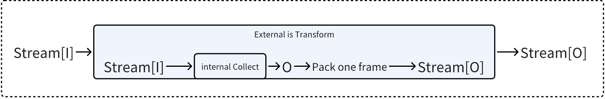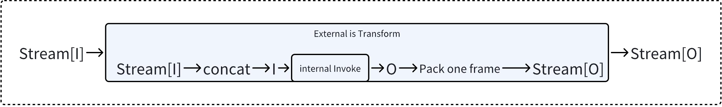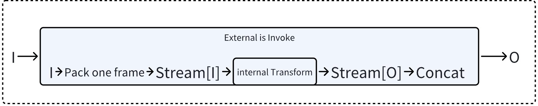 - If neither is implemented, then Transform must be implemented, wrapping the Invoke with Transform, i.e., transforming input to single-frame stream and concatenating output.