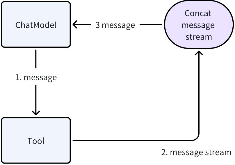 In the diagram above, if the Tool is a StreamableTool, i.e., the output is StreamReader[Message], then Tool -> ChatModel could have a streaming output. However, the Chat Model does not have a business scenario for receiving streaming input nor a corresponding interface. In this case, the Eino framework will automatically help the ChatModel gain the capability to receive streaming input: