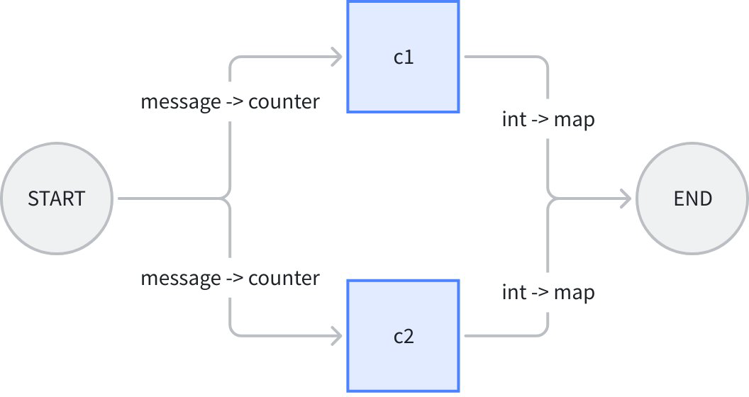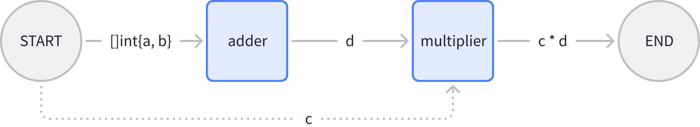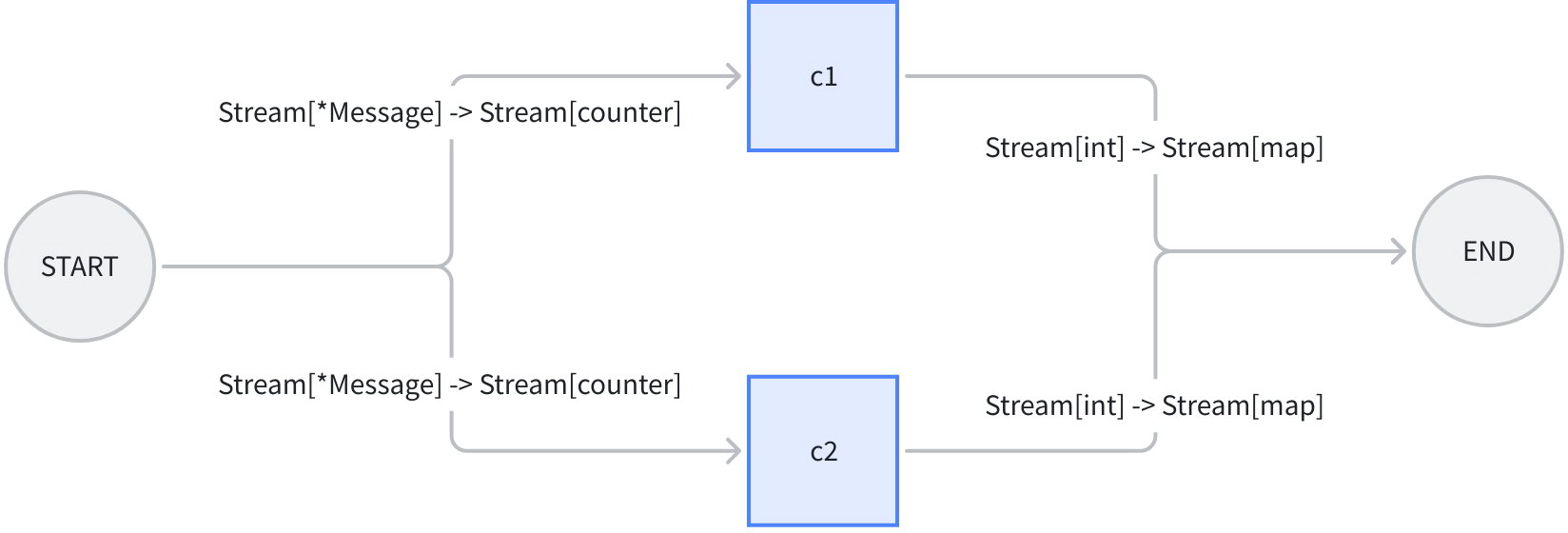 In the figure above, workflow’s overall input is a message struct, c1 and c2 lambdas’ inputs are both counter struct, outputs are both int, workflow’s overall output is map[string]any. Code as follows: