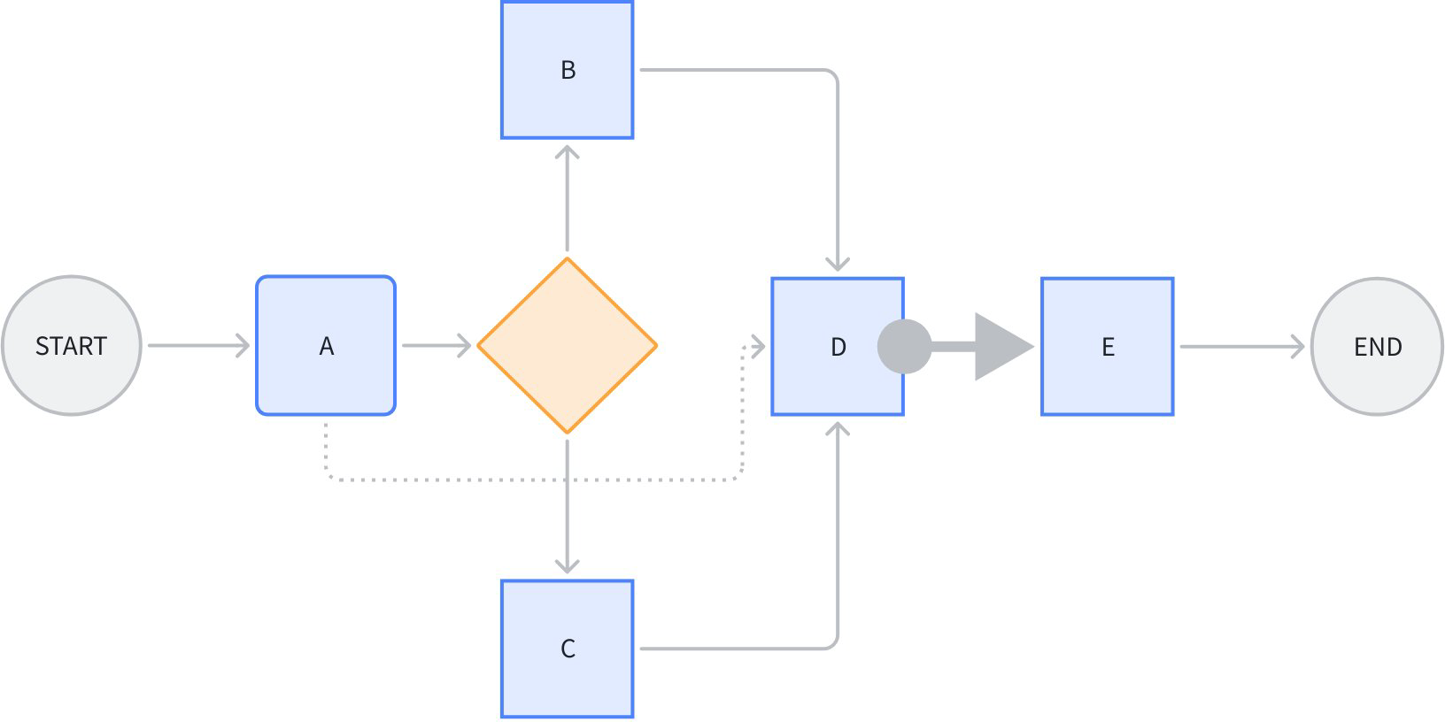 Note that the premise for data flow transfer is that a control flow must exist. For example, the data flow from A->D depends on control flow from A->branch->B->D or A->branch->C->D existing. Data flow can only reference predecessor nodes’ outputs.